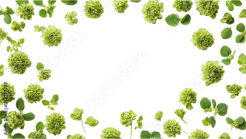 Green Floral Square Frame on White Background, vibrant clusters of green flowers create a striking geometric design, perfect for decor or display