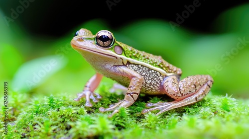 Green frog on moss, rainforest background, wildlife photography, nature stock