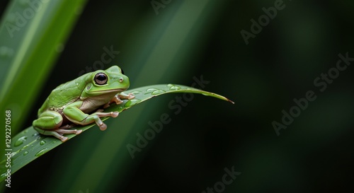 Green frog perched on a vibrant green leaf glistening with water droplets, evoking a serene and peaceful atmosphere against a dark rainforest backdrop