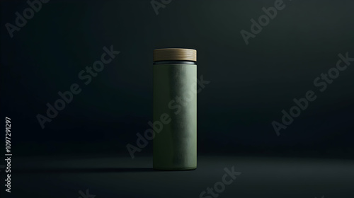 Green glass bottle with wooden lid on dark background.