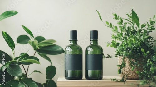 Green glass bottles with black labels and indoor plants on a wooden shelf Copy Space