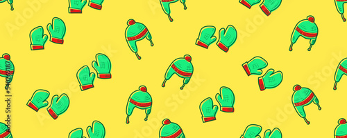 green gloves and beanie warmer on soft yellow background as seamless pattern wallpaper on green pastel background header