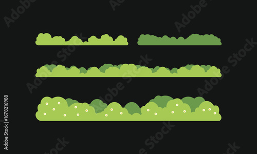 Green grass and bushes on dark background. Flat vector illustration of various garden plants and hedges with small flowers, perfect for landscapes, game assets, and children's book illustrations