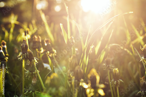 Green grass close-up with a setting sun backlight in summer evening