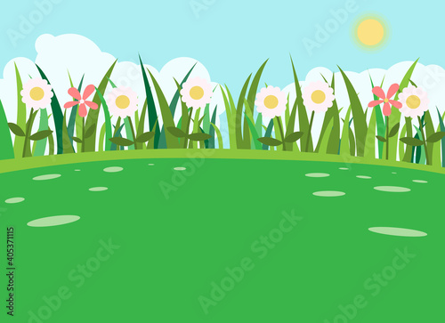 Green grass with flower and sky background.Nature landscape grass on green hill.Summer natural scene.Floral in spring.