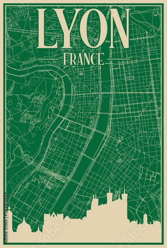 Green hand-drawn framed poster of the downtown LYON, FRANCE with highlighted vintage city skyline and lettering