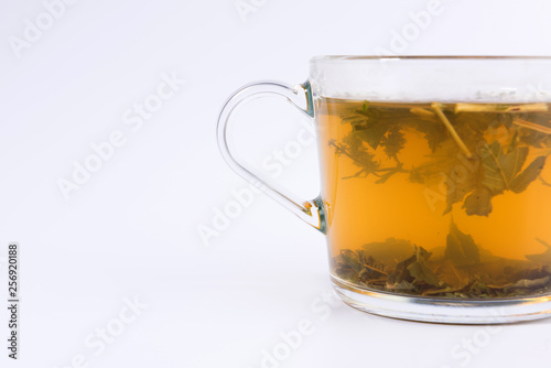 green herbal tea in a transparent cup isolated on white background