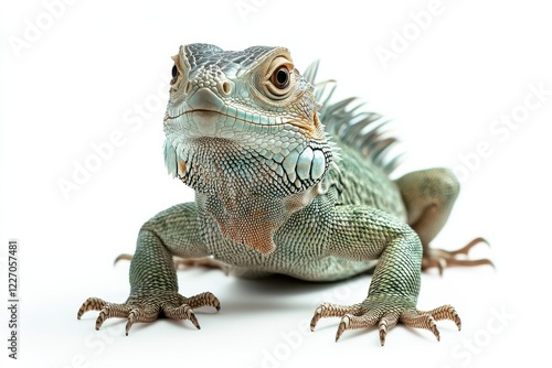 Green iguana posing against white background