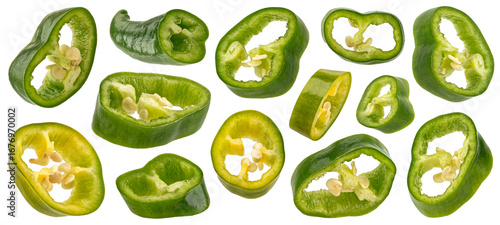 Green jalapeno pepper slices isolated on white background, full depth of field