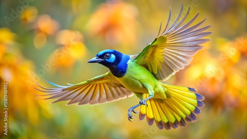 Green Jay Flying with Spread Wings and Colorful Blurred Background