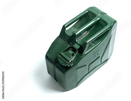 Green jerrycan on white background. Canister for gasoline, diesel gas