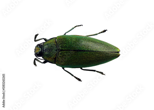 Green jewel beetle Steraspis congolana displays its striking metallic green exoskeleton in a close-up view, highlighting its unique texture and form against a transparent background