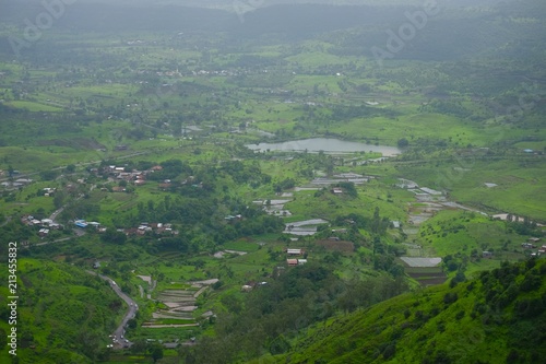 Green landscape surrounded by hills, mountains in monsoon season
