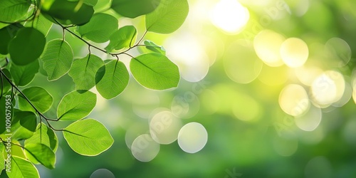 Green leaf background featuring blurred leaves. The light creates a bokeh effect with circles from the leaves, embodying the concept of a vibrant green world. Experience the essence of green.