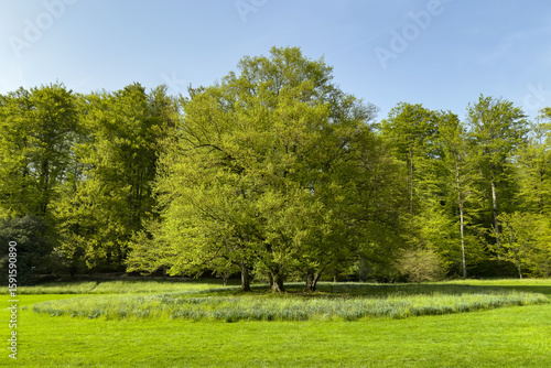 green leafy trees on a sunny grassy meadow surrounded by fresh spring forest under a bright blue sky. clean manicured