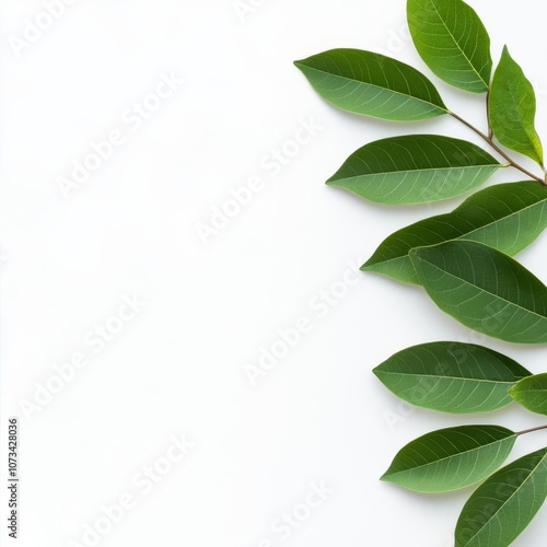 Green leaves against white background, diffused light, natural shadows, botanical style
