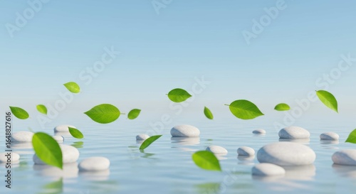 Green leaves and white stones float on water under a blue sky.