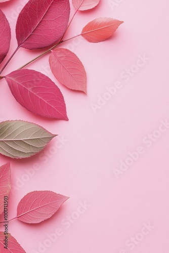 Green leaves arranged artistically on a pink background for a vibrant decorative effect