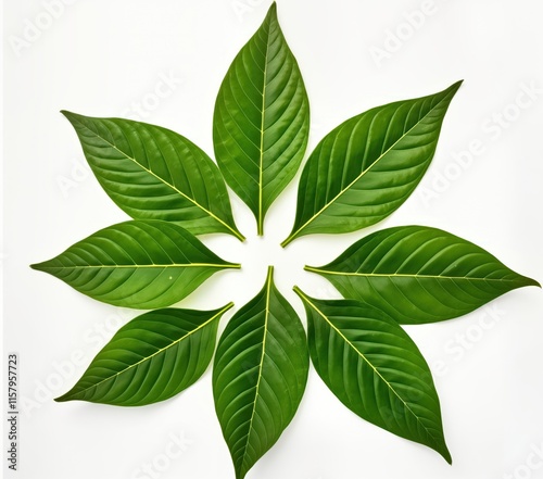 Green leaves arranged in circular pattern on white background. Natural plant elements create visual harmony. Freshness, healthy growth emphasized. Ideal for eco-friendly products nature-themed design