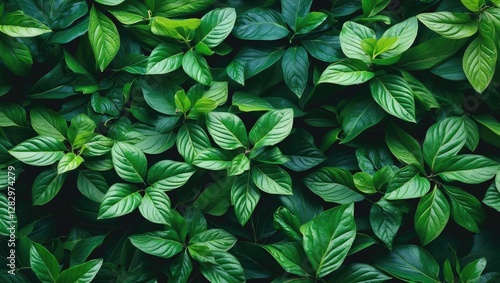 Green leaves background featuring various shapes and sizes of lush foliage in a natural botanical setting.