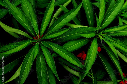 Green leaves background. Green leaves color tone dark in the morning.