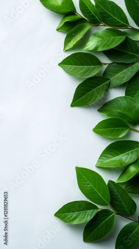 Green leaves bordering a white textured background creating negative space