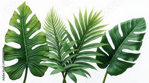 Green Leaves Of Tropical Plants Bush (Monstera, Palm, Rubber Plant, Pine, Bird Nest Fern). Transparent, Cutout, Or Clipping Path