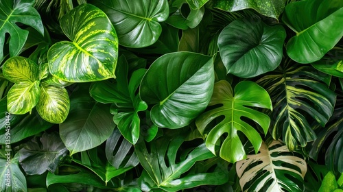 Green leaves of tropical plants bush (Monstera, palm, rubber plant, pine, bird’s nest fern) floral arrangement indoors garden nature backdrop isolated on white background thailand, clipping path.