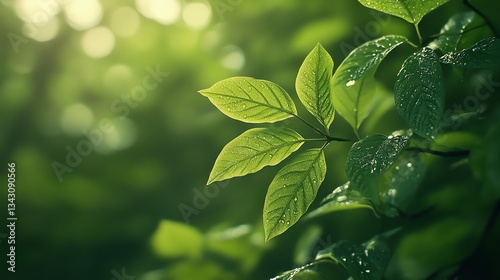 Green Leaves with Water Droplets Sparkling in Soft Sunlight in Forest