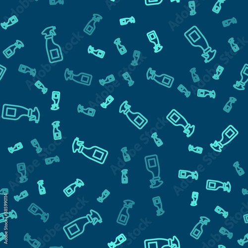 Green line Cleaning spray bottle with detergent liquid icon isolated seamless pattern on blue background. Vector.