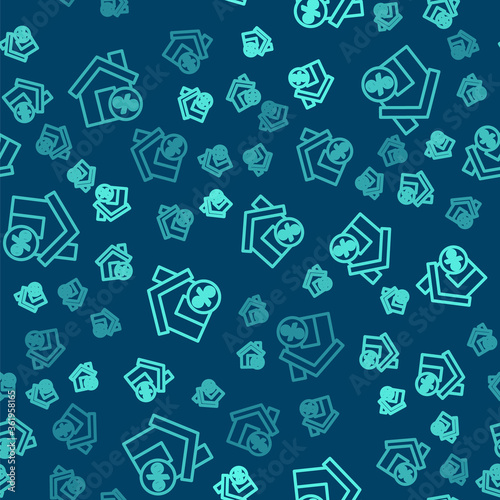 Green line House with percant discount tag icon isolated seamless pattern on blue background. House percentage sign price. Real estate home. Vector Illustration.