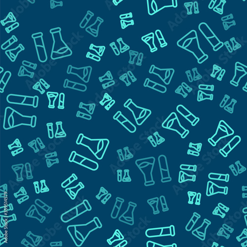 Green line Test tube and flask - chemical laboratory test icon isolated seamless pattern on blue background. Laboratory glassware sign. Vector Illustration