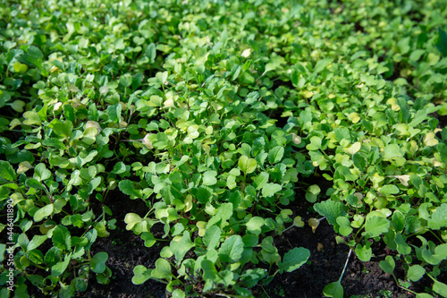 Green manure, siderates. Fodder radish sprouts grow in vegetable garden bed. Organic fertilizer.