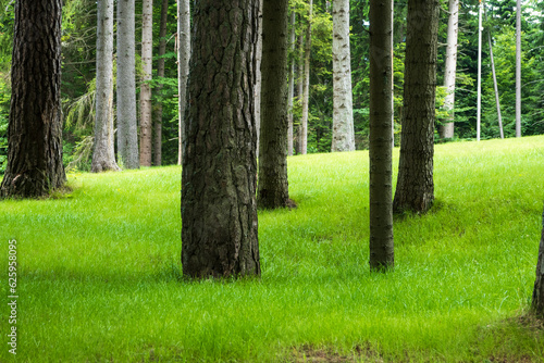 Green meadow among the trees, mountain fresh grass