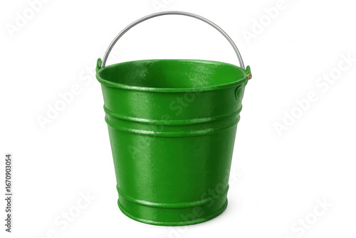 Green metal bucket with sturdy handle, sitting empty against transparent backdrop, waiting for utility purposes