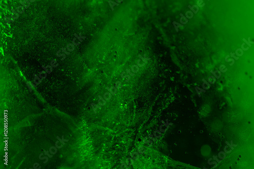 Green microscopic fluorescent image. Abstract macro water background with ice.