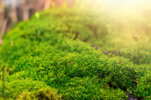 Green moss close up. Macrocosm of plants. Early spring and gardening concept.