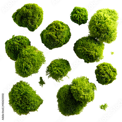 Green moss scattered, isolated on white background, top view, clipping --v 7.0
