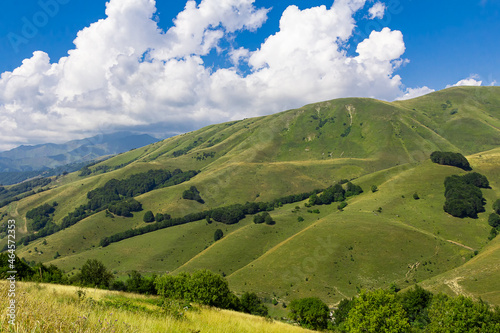Green mountains of Ossetia. Cascades of mountain peaks against the blue sky. Caucasus