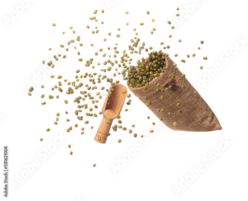 Green mung beans fly throw up in Sack Bag, green mung bean float explode, abstract cloud fly. Dried green mung beans splash throwing in Air. White background Isolated high speed shutter, freeze motion