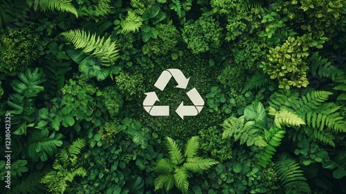Green Nature Background with Recycling Symbol Amidst Lush Foliage