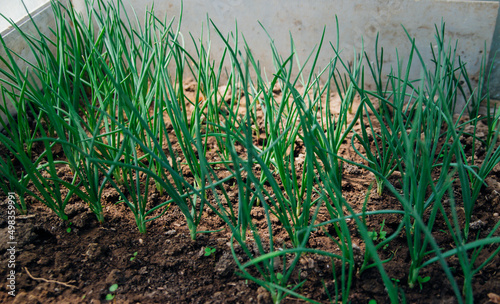 Green onion feathers grow in the garden. Spring gardening season. Agricultural industry. Fresh herbs and vegetables.