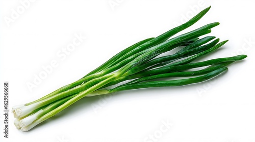 Green onion placed diagonally on white background food ingredient flat lay