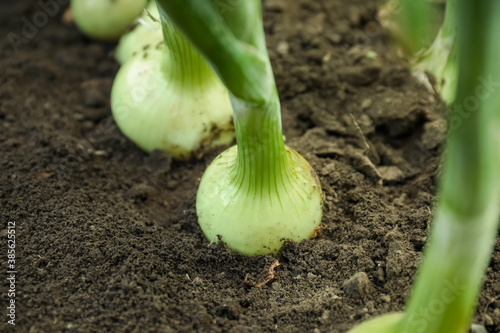 Green onions growing in field, closeup. Harvest season