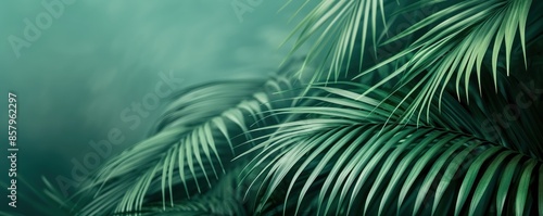 Green palm leaves in soft focus. Nature background theme. Jungle scenery.