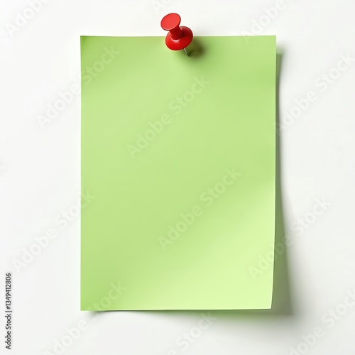 Green paper note with red push pin isolated on white background. Reminder message, empty memo board, office business communication. Blank paper for text, business idea, information.