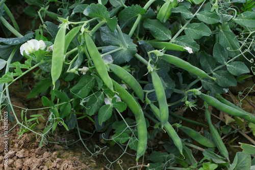 Green peas grow in the garden Beautiful close up of green fresh peas and pea pods. Healthy food, Bush of sweet pea with ripe pods cultivated on vegetable garden, green peas closeup in nature, Pakistan