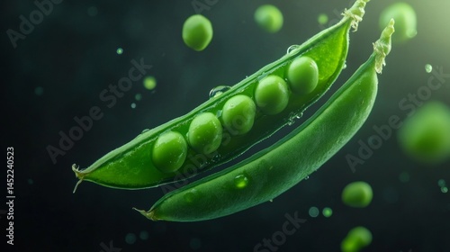 Green peas in a pod are shown up close. They look fresh and healthy against a dark background, perfect for cooking.