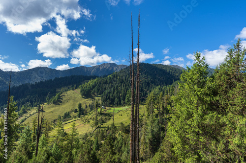 Green pine tree forest in the Himalayas with cloudy blue sky. Beautiful temperate forest in the mountains.