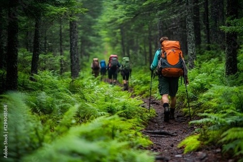 Green pine trees and ferns along a forest trail with hikers.